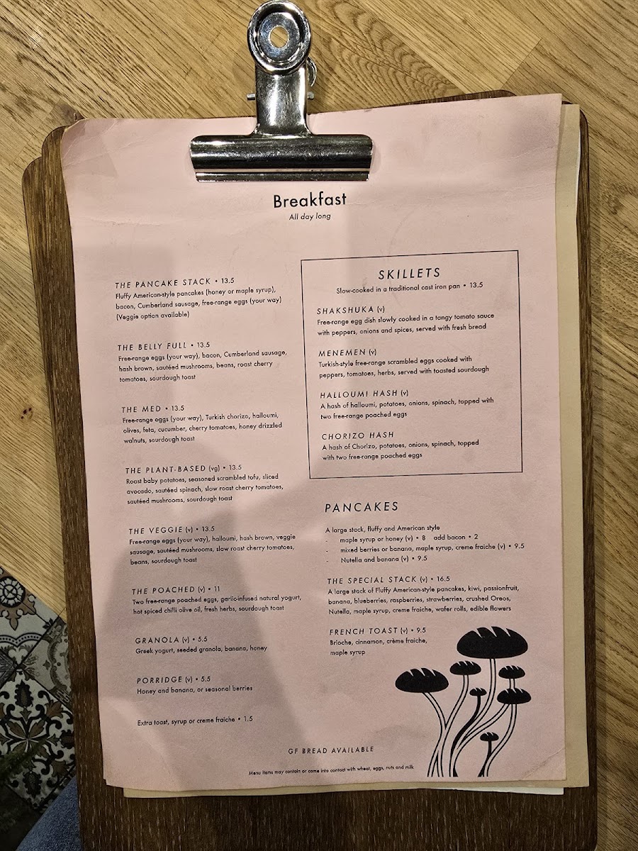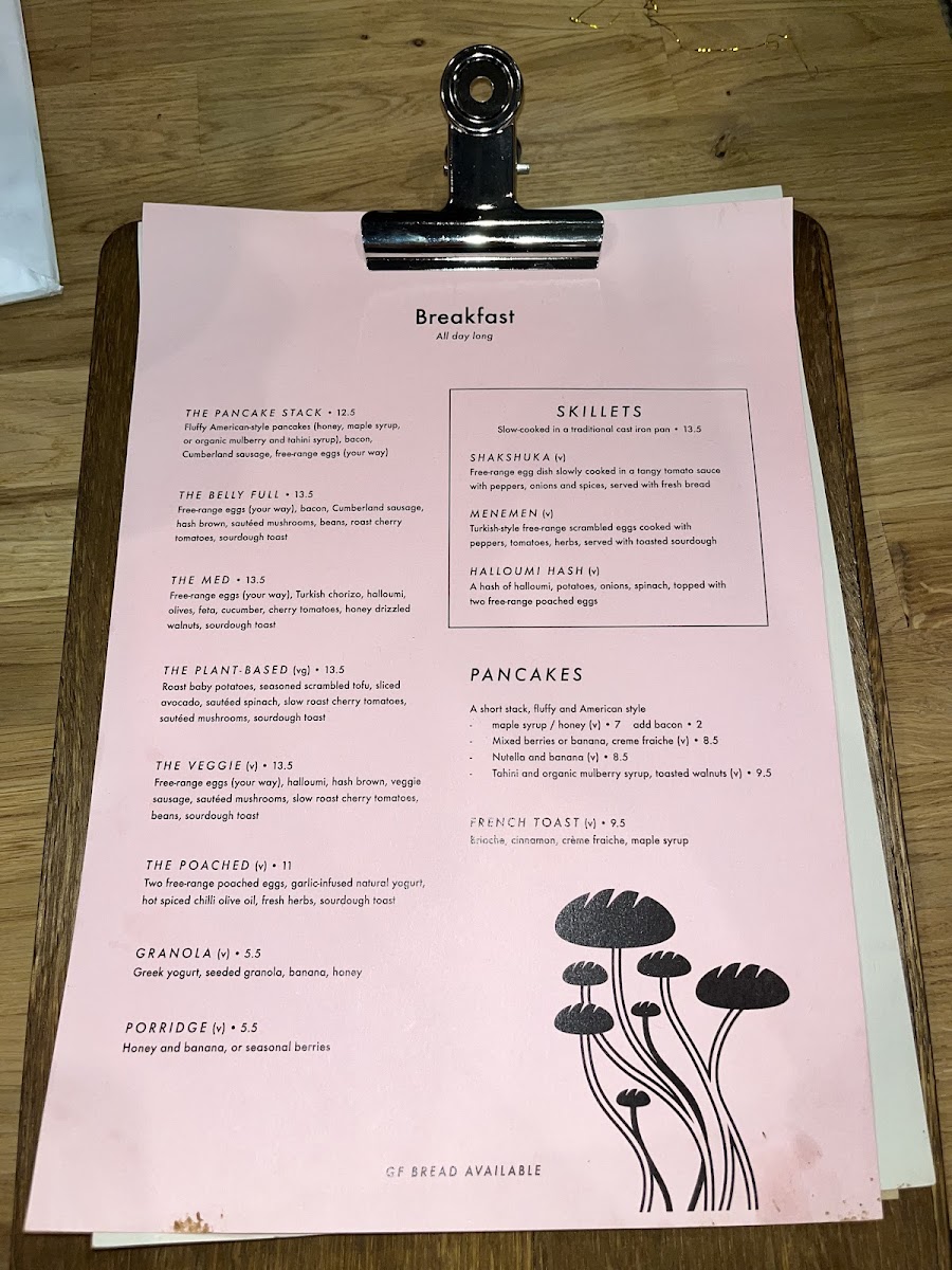 Breakfast choices include varied options such as The Pancake Stack, The Belly Full, The Med, The PlantBased, and The Veggie, all priced at £13.50. Lighter morning options like Granola and Porridge are also available for £5.50 each.